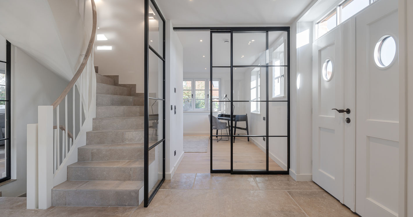Im Innenbereich erwarten Sie Naturstein- und Fliesenfußböden sowie Landhausdielen aus astiger Eiche, handgehobelt und weiß geölt, die für ein warmes und einladendes Ambiente sorgen. Die Bäder sind mit hochwertigen Sanitäreinrichtungen von Villeroy & Boch und schwarzen Armaturen von Hans Grohe ausgestattet. Der schwarze, elegante Handtuchhalter der Serie Add Stories sowie die im Erdgeschoss und Untergeschoss eingebauten Waschtisch-Natursteinbecken runden das edle Design ab. Bei den Türgriffen handelt es sich um matt schwarze, eckige Modelle, die perfekt mit den modernen Glaselementen der schwarzen Schiebetür nach RAL harmonieren.