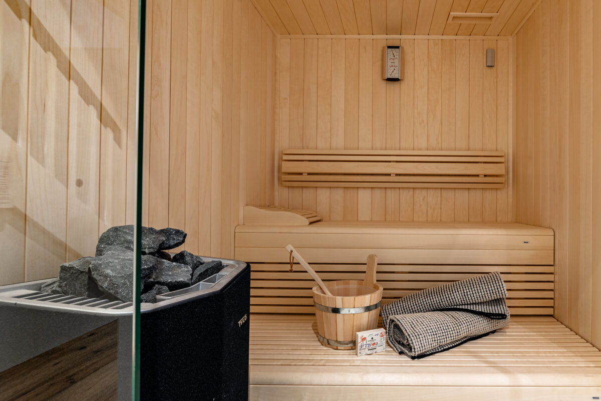 Ein kleiner und privater Wellnessbereich mit Sauna, Duschbadewanne und WC im Untergeschoss optimiert diese Ausnahme-Offerte.
