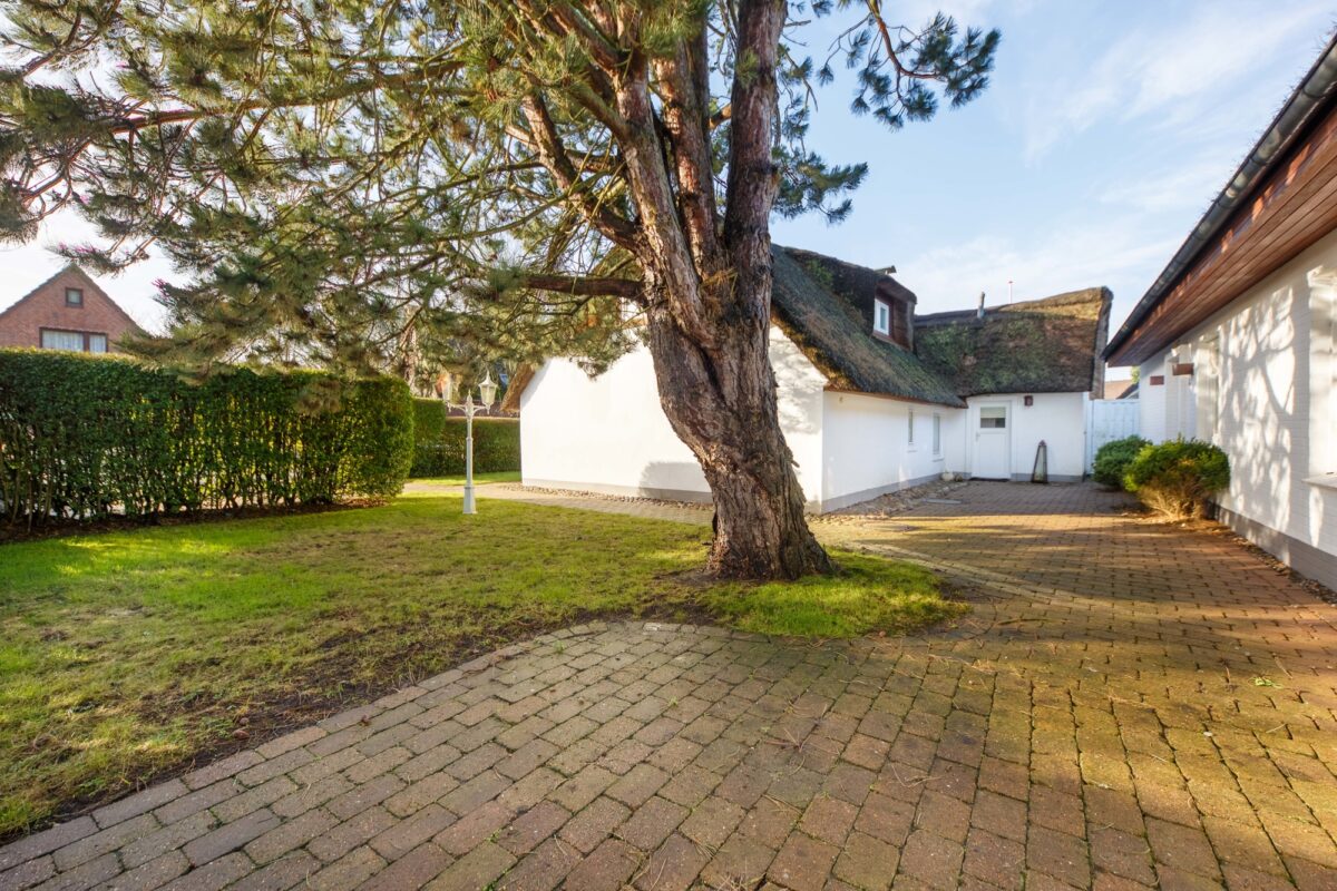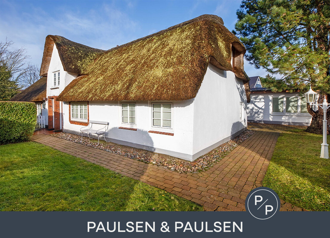Zum Verkauf steht eine charmante Doppelhaushälfte in idyllischer Lage von Tinnum. Diese einmalige Immobilie besticht durch ihr traditionelles Reetdach und ist von einem liebevoll eingewachsenen Grundstück umgeben, welches mit einem großen, weißen Auffahrtstor abgeschlossen wird.