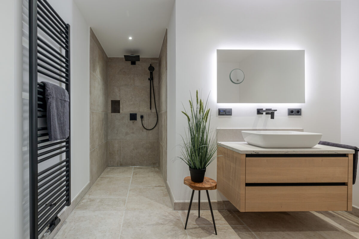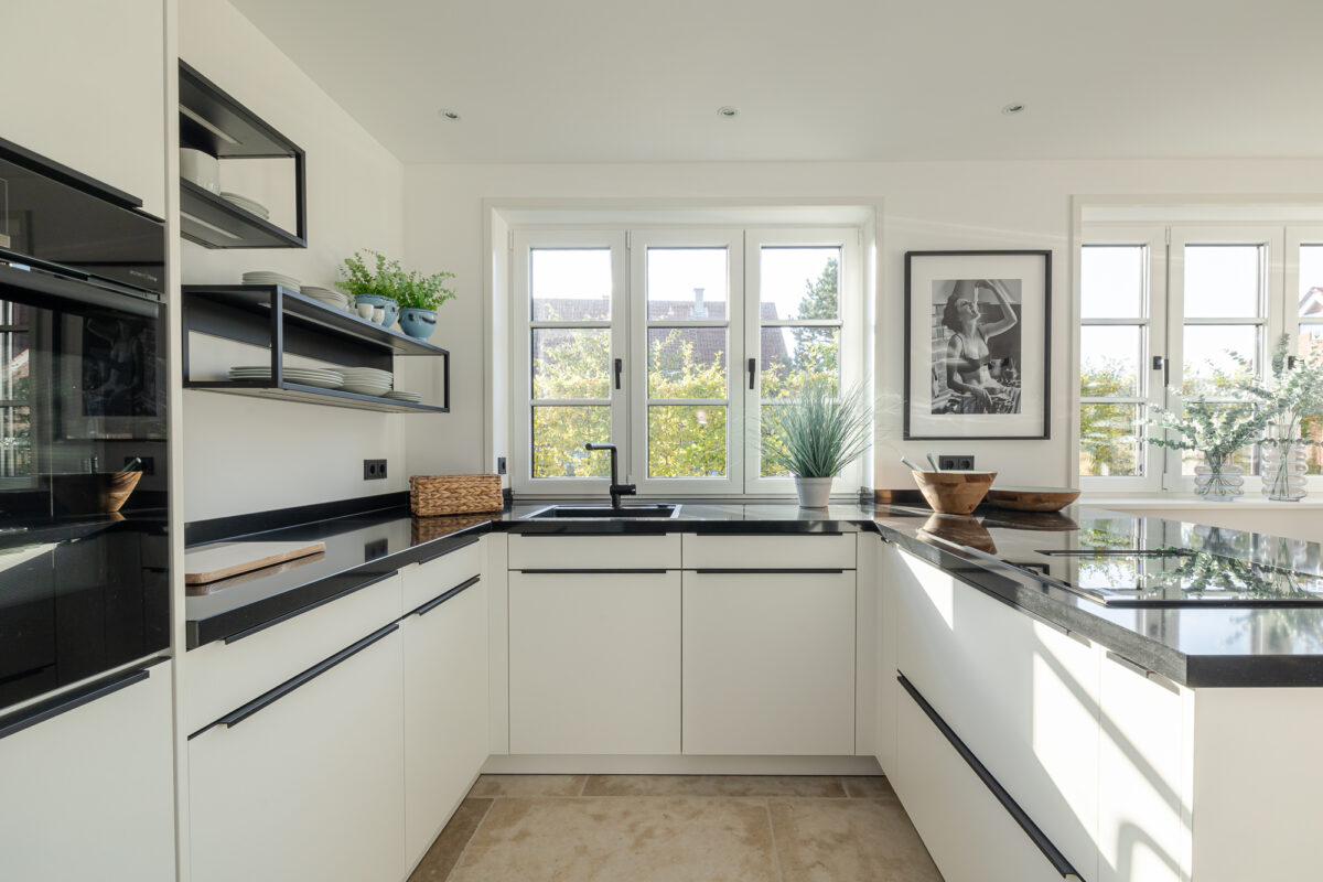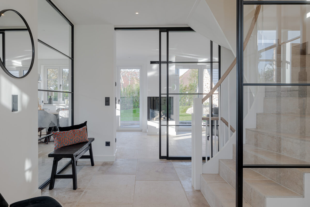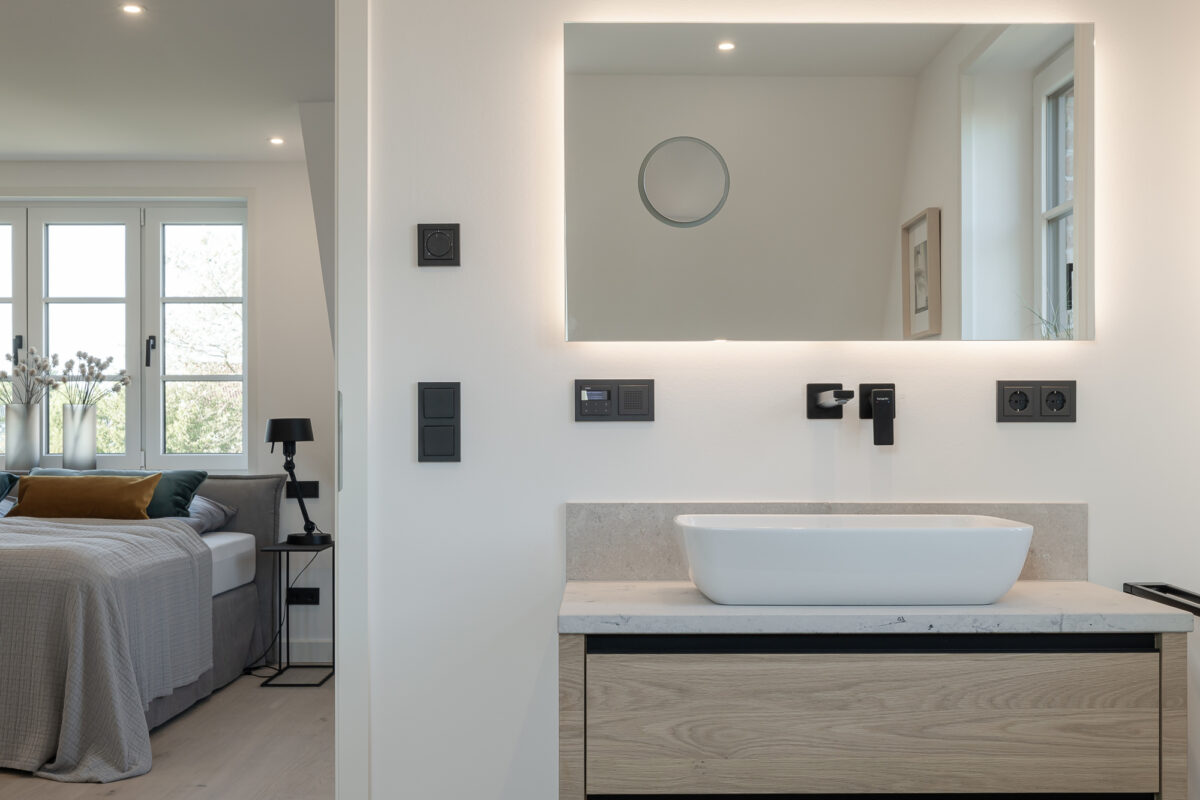 Im Innenbereich erwarten Sie Naturstein- und Fliesenfußböden sowie Landhausdielen aus astiger Eiche, handgehobelt und weiß geölt, die für ein warmes und einladendes Ambiente sorgen. Die Bäder sind mit hochwertigen Sanitäreinrichtungen von Villeroy & Boch und schwarzen Armaturen von Hans Grohe ausgestattet. Der schwarze, elegante Handtuchhalter der Serie Add Stories sowie die im Erdgeschoss und Untergeschoss eingebauten Waschtisch-Natursteinbecken runden das edle Design ab. Bei den Türgriffen handelt es sich um matt schwarze, eckige Modelle, die perfekt mit den modernen Glaselementen der schwarzen Schiebetür nach RAL harmonieren.