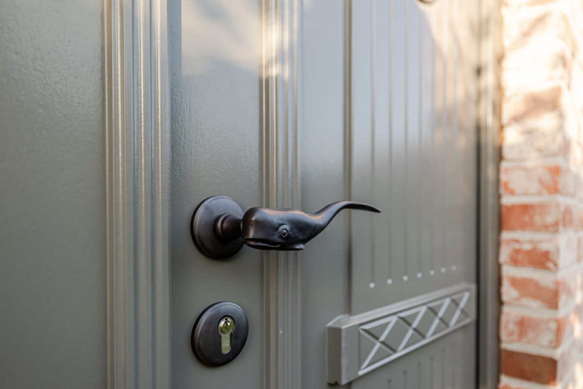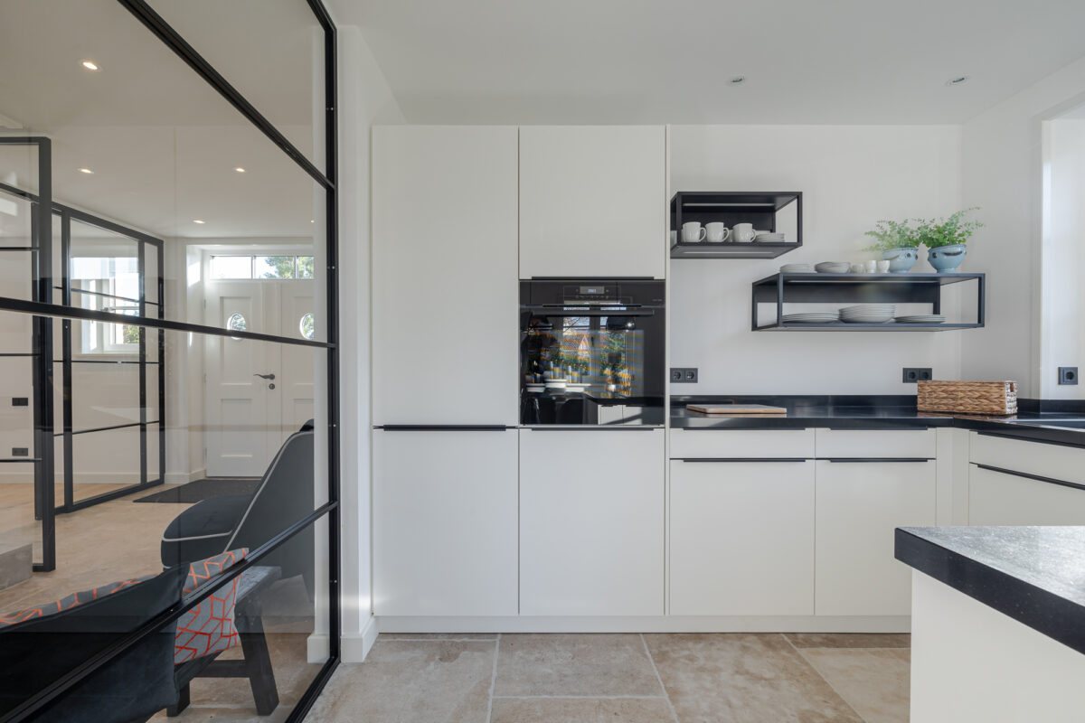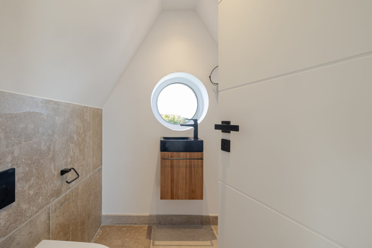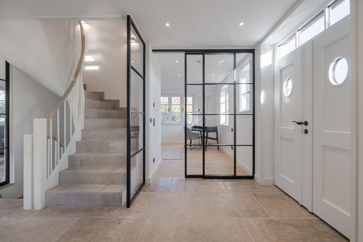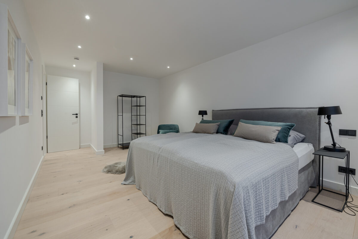 Im Innenbereich erwarten Sie Naturstein- und Fliesenfußböden sowie Landhausdielen aus astiger Eiche, handgehobelt und weiß geölt, die für ein warmes und einladendes Ambiente sorgen. Die Bäder sind mit hochwertigen Sanitäreinrichtungen von Villeroy & Boch und schwarzen Armaturen von Hans Grohe ausgestattet. Der schwarze, elegante Handtuchhalter der Serie Add Stories sowie die im Erdgeschoss und Untergeschoss eingebauten Waschtisch-Natursteinbecken runden das edle Design ab. Bei den Türgriffen handelt es sich um matt schwarze, eckige Modelle, die perfekt mit den modernen Glaselementen der schwarzen Schiebetür nach RAL harmonieren.
