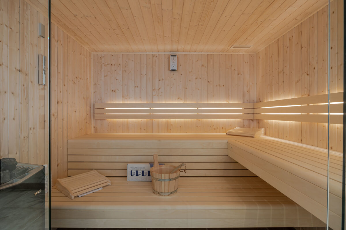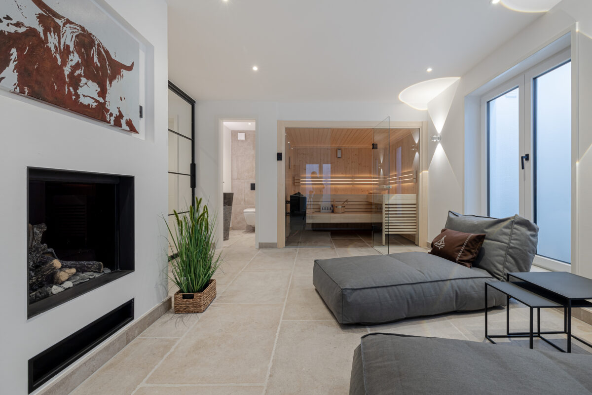 Im Untergeschoss befindet sich ein Abstellraum mit angrenzendem Bad zur individuellen Nutzung, ein Hauswirtschaftsraum sowie ein großzügiger Wellnessbereich. Dieser bietet pure Entspannung mit einer Sauna aus Fichtenholz und Sitzbänken aus Abachi-Holz sowie einem Boden aus Naturstein. Ausgestattet mit Sauna, Badewanne, großer Dusche und separatem WC einem Duschbad / WC und ebenfalls einem Gas-Kamin, können Sie hier den Tag ausklingen lassen.