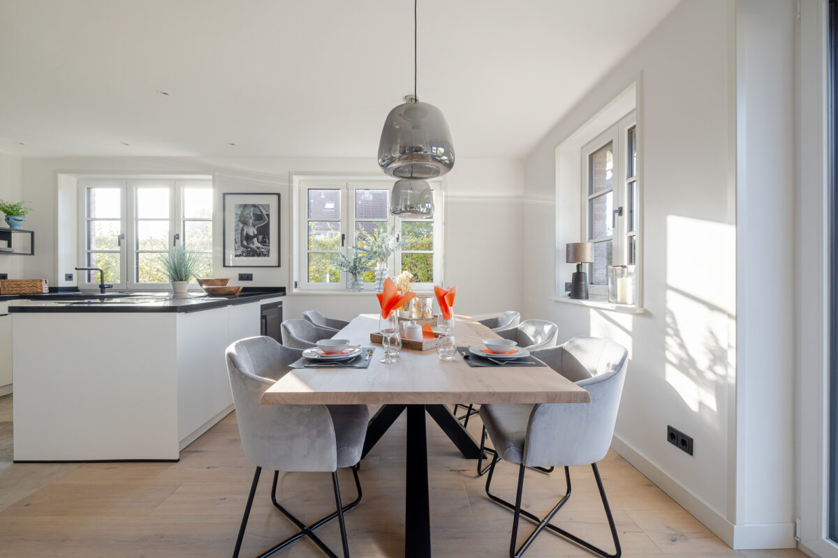 Über den östlich gelegenen Eingang gelangen Sie über den Flur zum Wohn- und Essbereich mit offener Küche. Die moderne Einbauküche verfügt über Kunststeinarbeitsplatten in Schwarz und hochmoderne Siemens-Einbaugeräte. Vom gemütlichen Sitzbereich fällt Ihr Blick auf den Gaskamin, der wohlige Abendstunden verspricht. Vom Wohnzimmer aus haben Sie direkten Austritt auf die große nach Süd-West ausgerichtete Terrasse aus Bangkirai Holz, welche zum Verweilen einlädt. Im Außenbereich sorgen BEGA LED-Wandleuchten für stimmungsvolle Beleuchtung. Der Garten, perfekt eingefriedet durch eine Hecke, besteht aus Rollrasen und einer charmanten Dünenlandschaft mit Dünengrasbepflanzung.