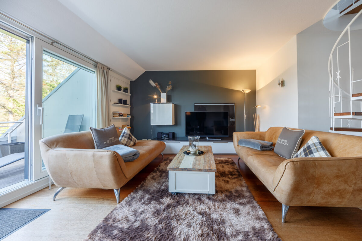 Im geräumigen hellen Wohnzimmer, das mit modernen Polstermöbeln und einem großen TV ausgestattet ist, können Sie herrlich entspannen. Die große Loggia, ausgerichtet nach Süd-Westen, wird schnell zu Ihrem Lieblingsort für sonnige Stunden oder gemütliche Abende.