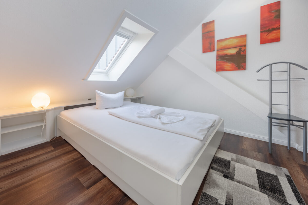 Im hellen Schlafzimmer mit großem Schrank und Sideboard finden Sie ausreichend Platz und Ruhe. Über die Treppe gelangen Sie zu zwei weiteren großen Räumen, die der Fantasie freien Lauf lassen.