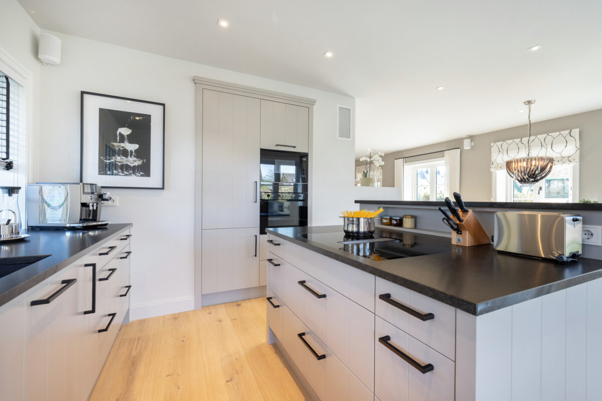 Jede Einheit ist mit einer vom Tischler maßgefertigten Einbauküche und hochwertigen Geräten von bspw. Miele und einem Bora-Kochfeld mit Umluftabzug ausgestattet. Der hell geflieste Küchenspiegel und die wertigen Armaturen runden jede Einheit ab. Die Bäder aller Wohneinheiten sind mit Natursteinen gefliest und mit Fußbodenheizung ausgestattet. Die freihängenden Waschtischunterschränke aus Eiche mit Aufsatzwaschbecken sind, ebenso wie die stimmungsvoll beleuchten Spiegel, vom Tischler maßgefertigt