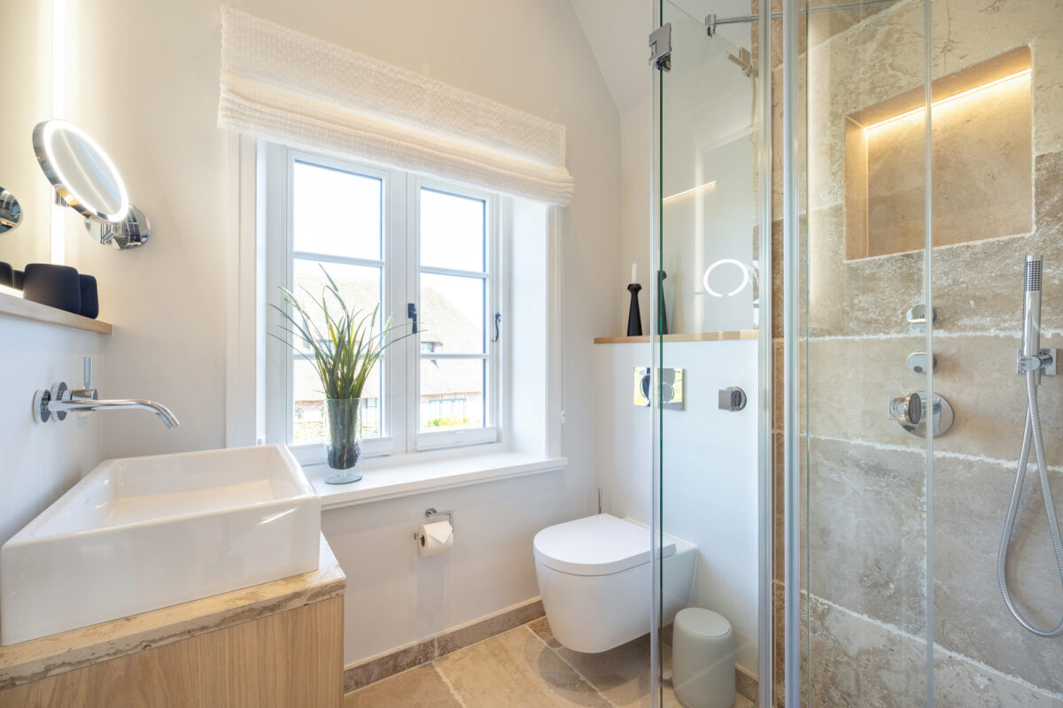 Die Verwendung ausschließlich erlesener Materialien, Armaturen und Badkeramiken wie Villeroy & Boch und Geberit sorgen für modernen Wohnkomfort.
