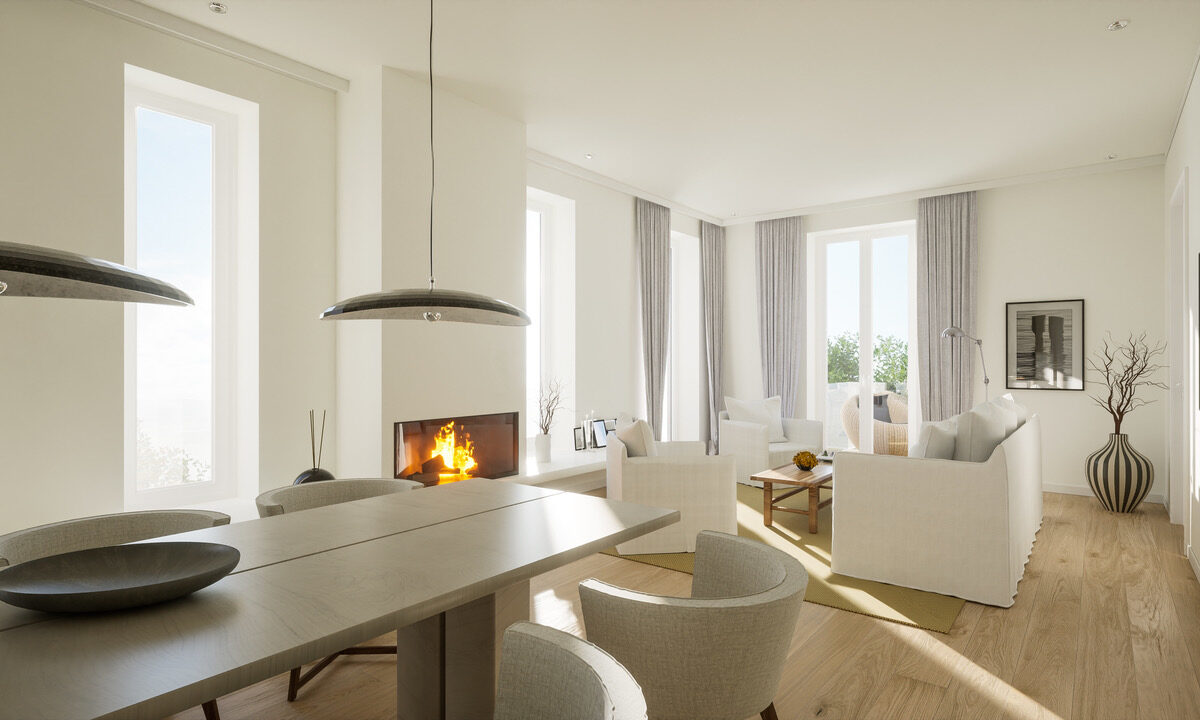Die moderne Einrichtung im Sylter Stil mit einem offenen, lichtdurchfluteten Wohn- und Essbereich begeistert mit zeitgemäßem Geschmack. Die Wohnungen besitzen einen eingebauten Kamin, der durch 3D-Flammeneffekte einem traditionellen Feuer ähnelt und damit die Wohlfühl-Atmosphäre und die Wärme eines offenen Kamins verströmt. Lassen Sie den Abend am Kamin ausklingen oder genießen Sie in der namenhaften Weinbar gegenüber handverlesene Weine.