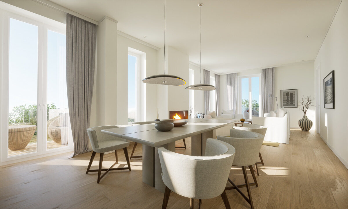 Die moderne Einrichtung im Sylter Stil mit einem offenen, lichtdurchfluteten Wohn- und Essbereich begeistert mit zeitgemäßem Geschmack. Die Wohnungen besitzen einen eingebauten Kamin, der durch 3D-Flammeneffekte einem traditionellen Feuer ähnelt und damit die Wohlfühl-Atmosphäre und die Wärme eines offenen Kamins verströmt. Lassen Sie den Abend am Kamin ausklingen oder genießen Sie in der namenhaften Weinbar gegenüber handverlesene Weine.