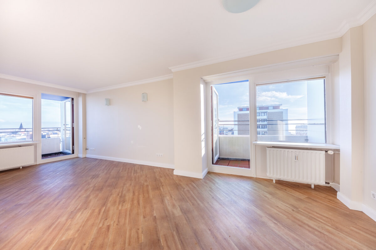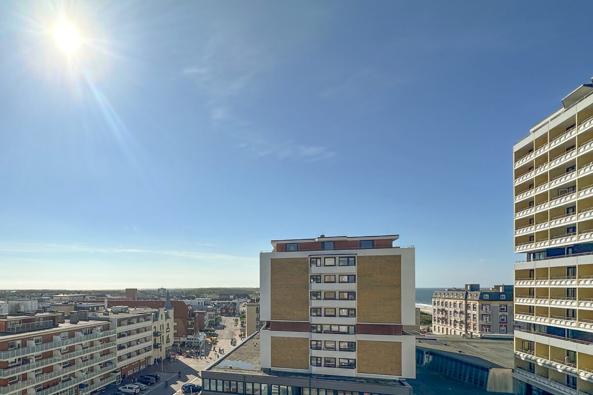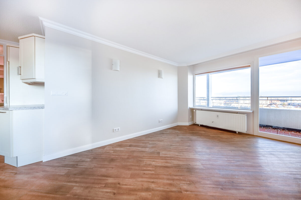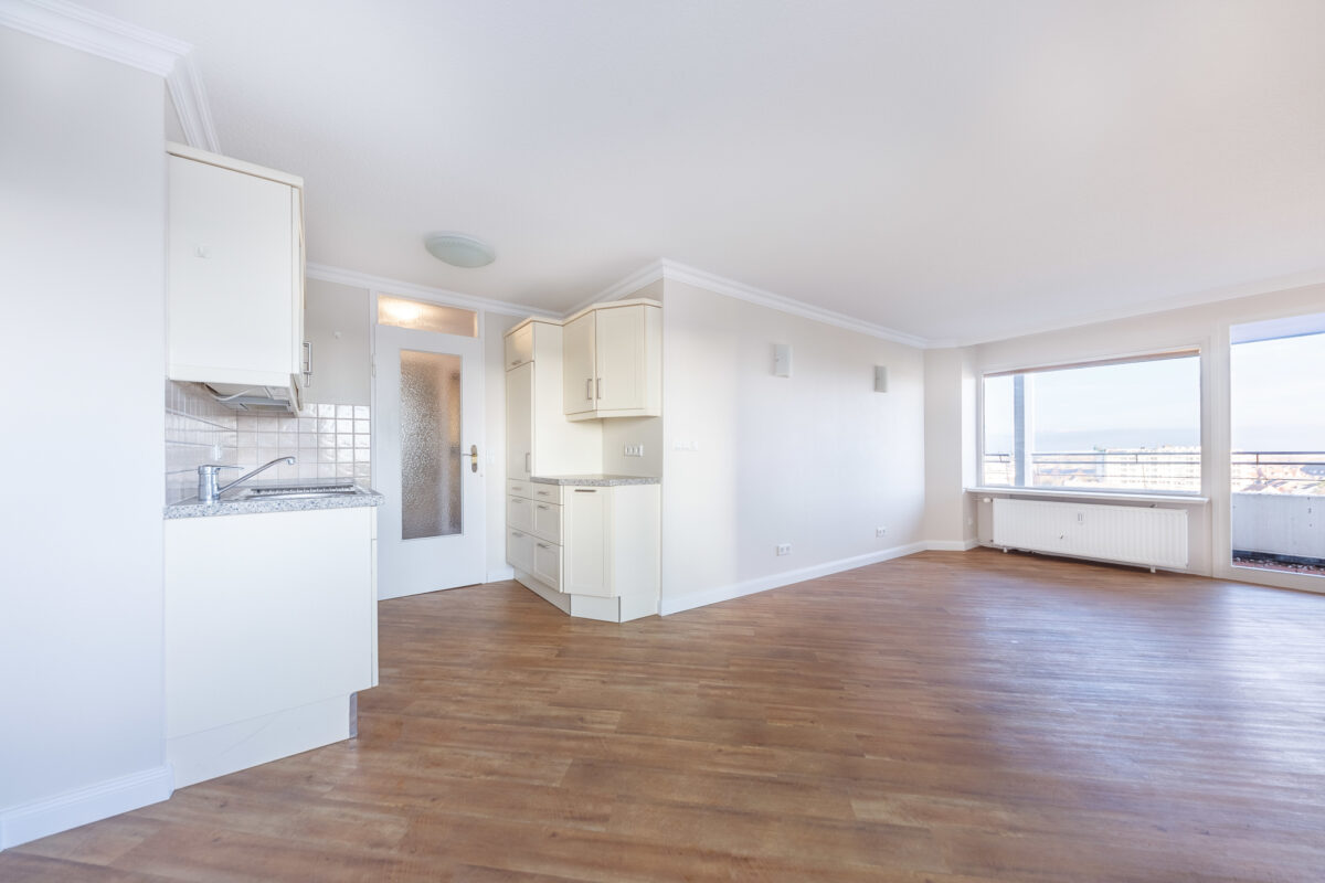 Vom geräumigen Wohnbereich haben Sie direkten Zutritt auf die beiden Balkone. Der nach Osten ausgerichtete, ca. 6 m lange Balkon bietet einen fantastischen Ausblick über die Insel und lädt in den morgendlichen Sonnenstunden zu einem genussvollen Frühstück ein. Der kleinere, nach Süden ausgerichtete Balkon bietet einen Blick auf das Meer und in das Westerländer Kurzentrum. Der offene Küchenbereich ist u.a. mit einem Backofen, einem Cerankochfeld sowie einem Kühlschrank ausgestattet.