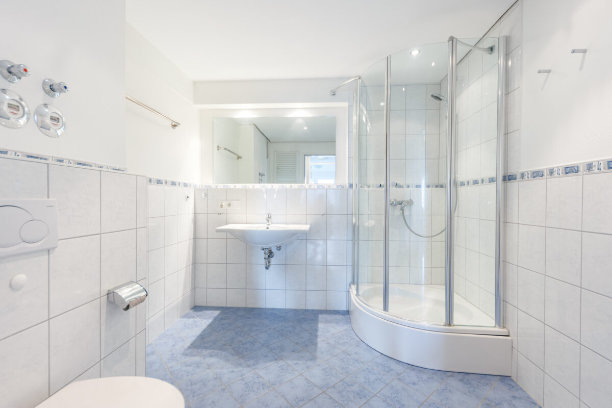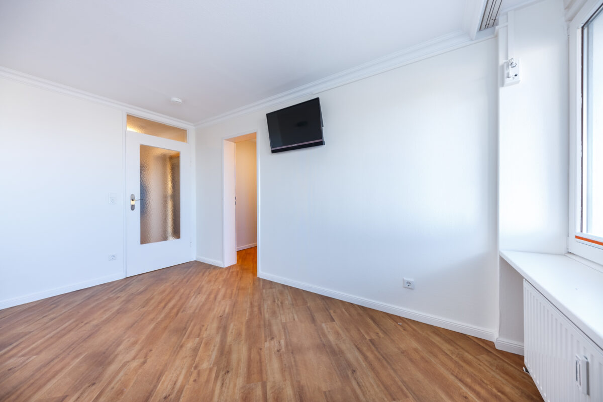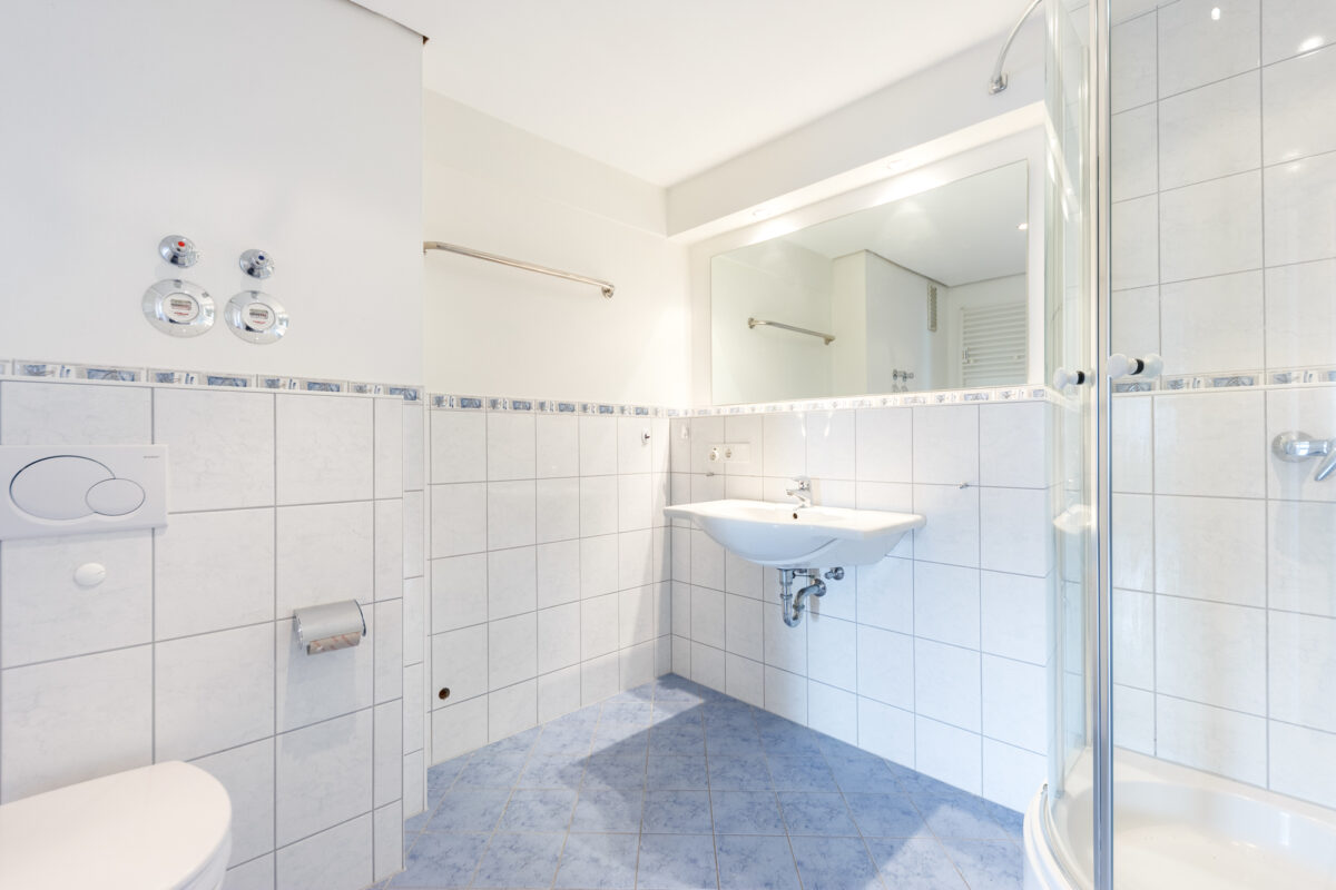 Auf der gegenüberliegenden Flurseite befindet sich das großräumige Badezimmer mit Dusche und Handtuchheizkörper. Das separate Schlafzimmer verfügt über einen Abstellraum, der alternativ auch als Ankleidezimmer genutzt werden kann.