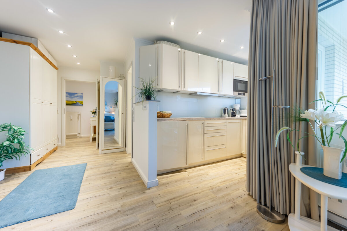Die modern eingerichtete Einheit verfügt über einen Wohn- und Schlafbereich, ein Badezimmer mit Dusche, einen Vorflur mit Garderobe und eine offene Küchenzeile. Diese ist u.a. mit einem Geschirrspüler, einem Cerankochfeld, einer Mikrowelle mit Backfunktion und einer Kühl-/ Gefrierkombination ausgestattet.